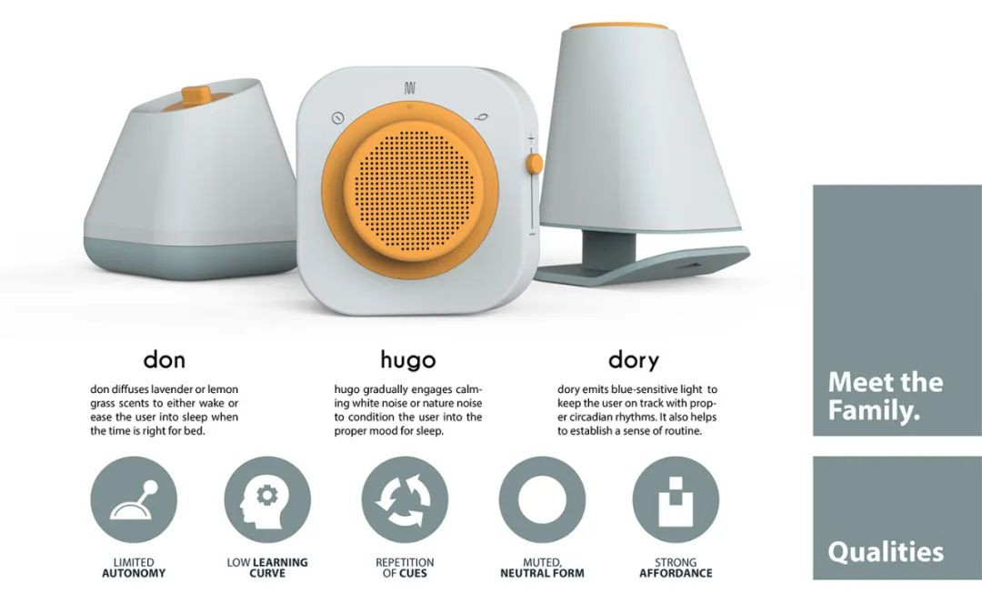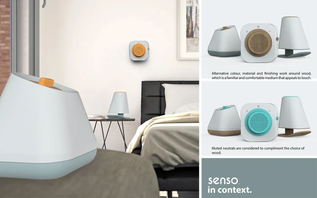 Senso老年痴呆患者智能睡眠系统,此款产品有助于为老年痴呆症患者创造最佳睡眠环境,它利用视觉、嗅觉和声音等辅助感官方法来调节和提示用户入睡。使老年人睡眠质量提高。