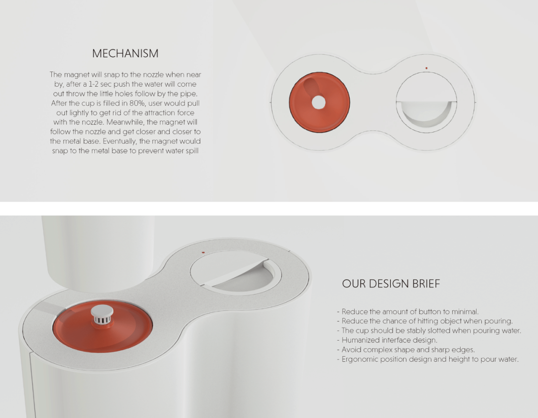 Blind friendly water dispenser这是一款为盲人设计的饮水机,盲人在使用普通饮水机时对水位变化无法感知从而带来安全隐患,所以此款设计采用从水杯下部注水,并添加过滤装置同时有盲文标识,使用方便又安全。