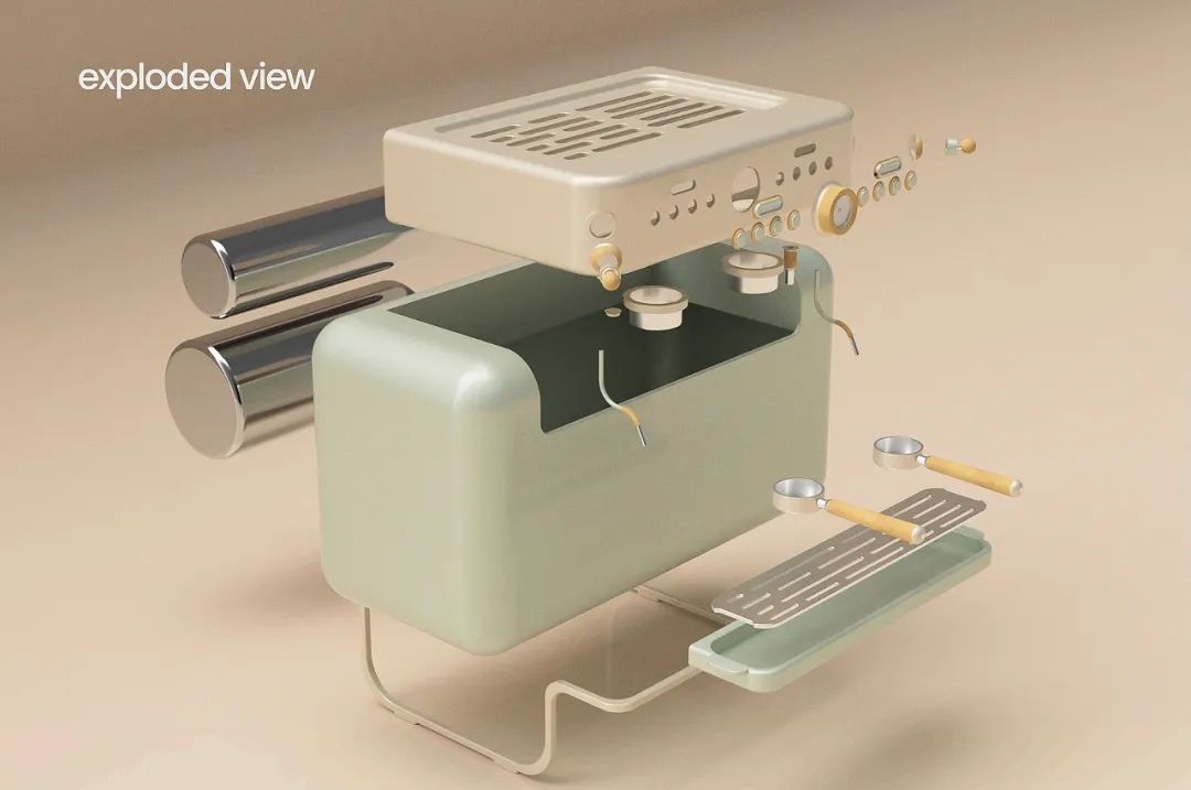 Retro Modern浓缩咖啡机,将复古设计与现代机器结合在一起,通过柔和的绿色和奶油色的渲染,使餐厅或咖啡厅看起来就像家一样温馨。