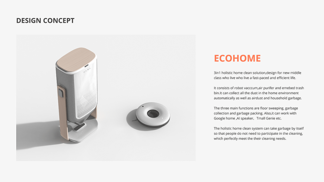 ECOHOME由机器人吸尘器、空气净化器和emembed垃圾桶组成。它可以自动收集家庭环境中的所有灰尘以及空气灰尘和生活垃圾。