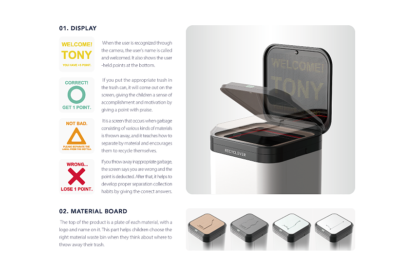 RECYCLEVER 是一款教育智能垃圾桶,通过赠送积分奖励和成就,鼓励孩子参与单独收集。
