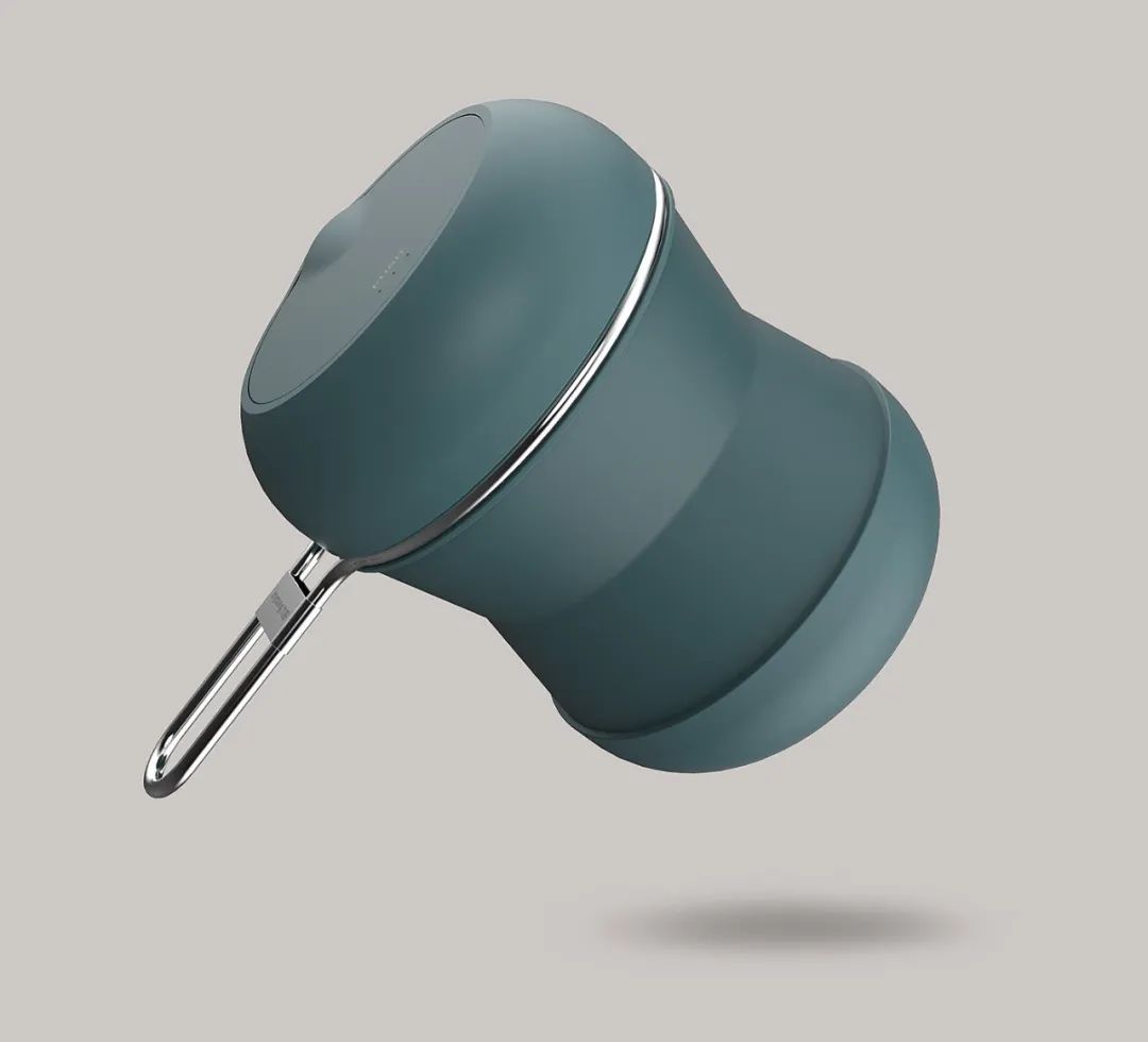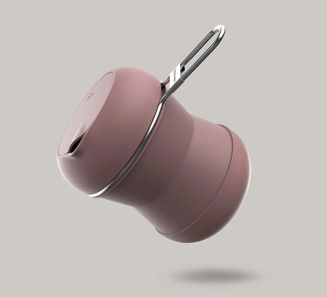这是一款折叠式电热水壶设计,采用耐高温食品安全硅材料制成,旁边配有不锈钢手柄,可让您方便地挂在背包上。