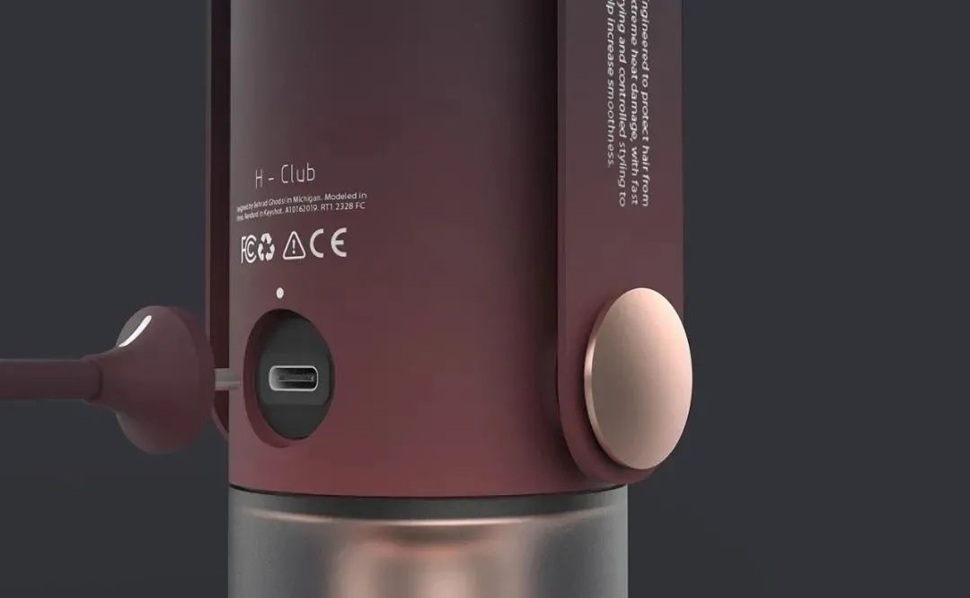 这款吹风机的整体造型采用圆柱形,只有在出风口处保留方便定型的收风造型,整体运用的是矩形和圆形元素。
