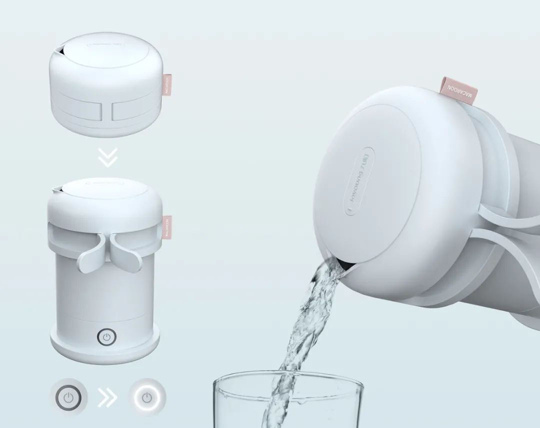 该水壶的主体由硅树脂材料制成,以便于折叠和存放,按下电源按钮将水烧开时,其主体将展开,并且开关周围的环形指示灯也会亮起。