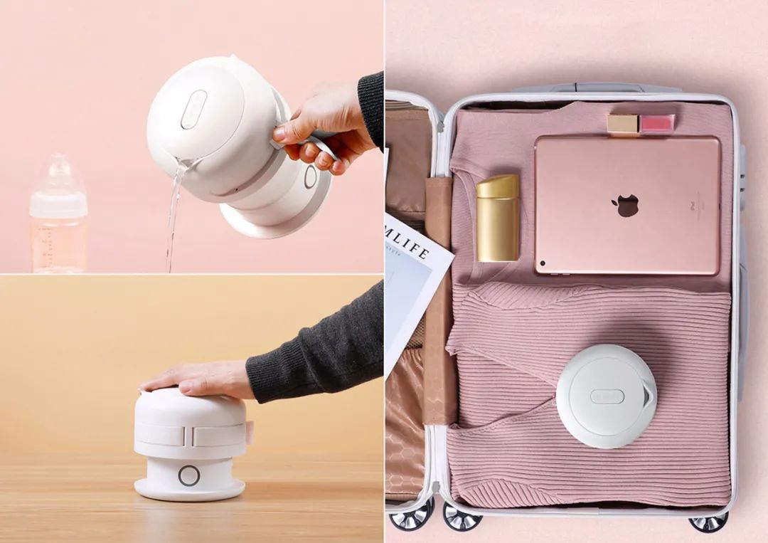 这是一款便携式折叠电热水壶,适合经常出差、旅行的用户。