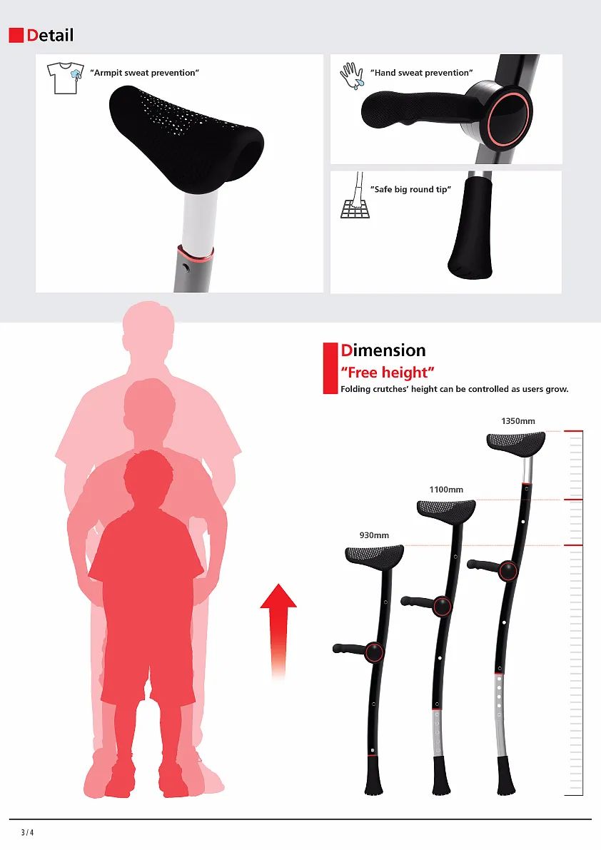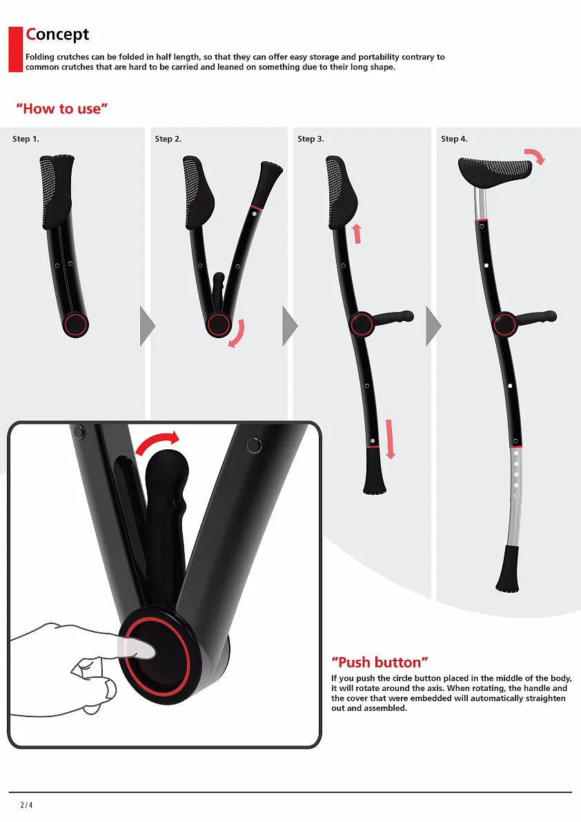 而这款折叠拐杖可以对半折叠,只要按一下位于拐杖中点的按钮。长度可以延长,适用于不同的高度和不同年龄的人,存放也更方便。