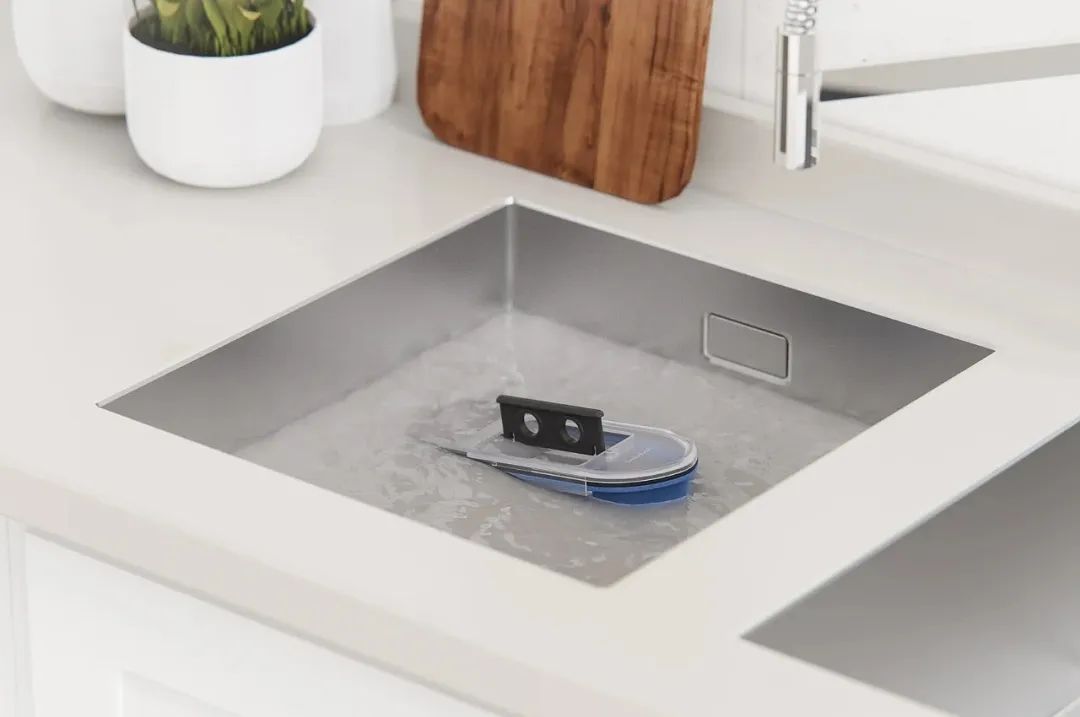 容器的形状灵感来自一艘船,如果孩子把食物吃光,容器会漂浮在水面,如果剩余的食物过多,船就会失去平衡而下沉。
