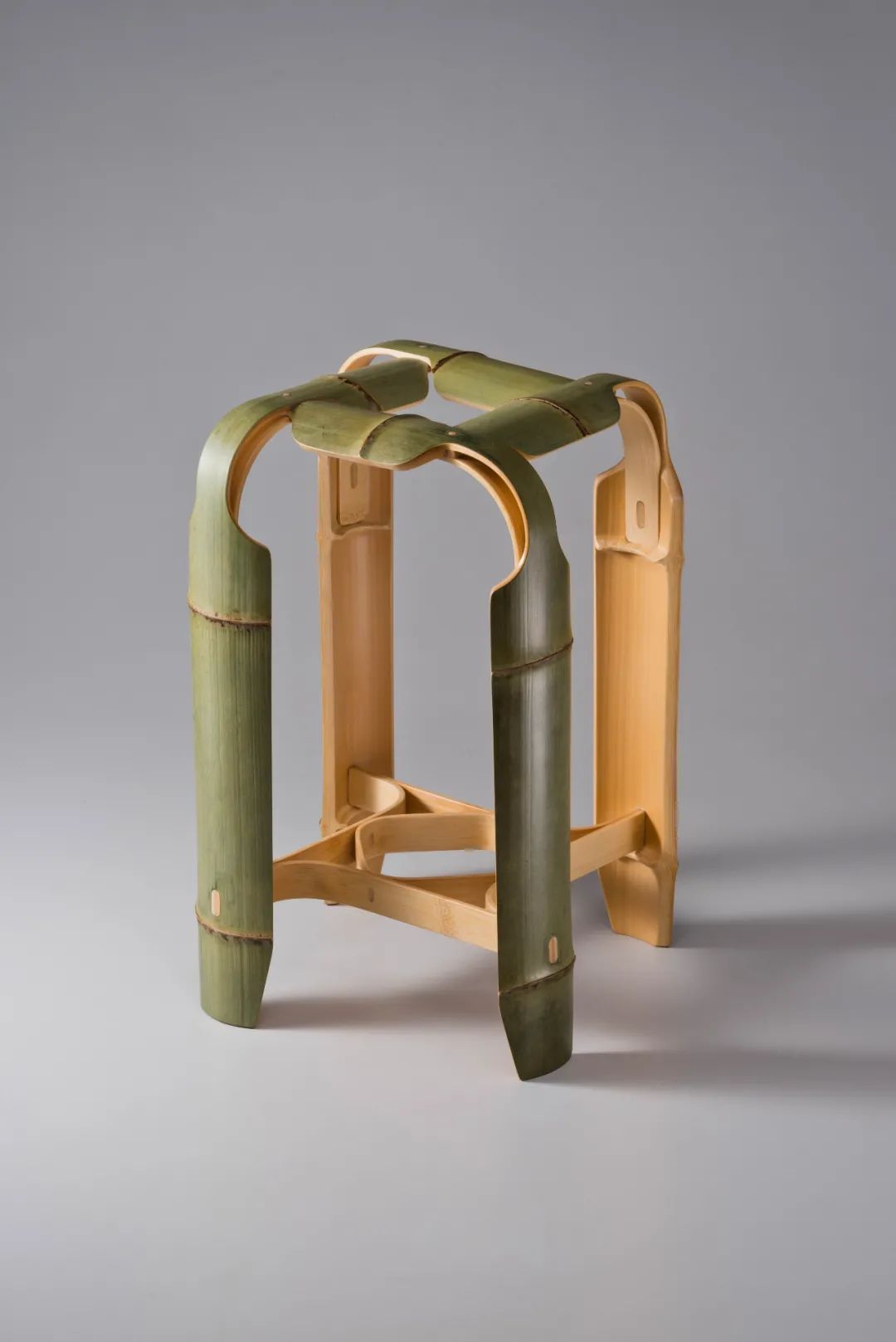 这把凳子是由毛竹制成,经过特殊处理,保留了表面的绿色。这样可以保持原来的颜色,永不褪色。