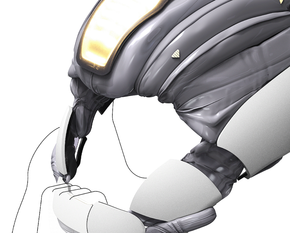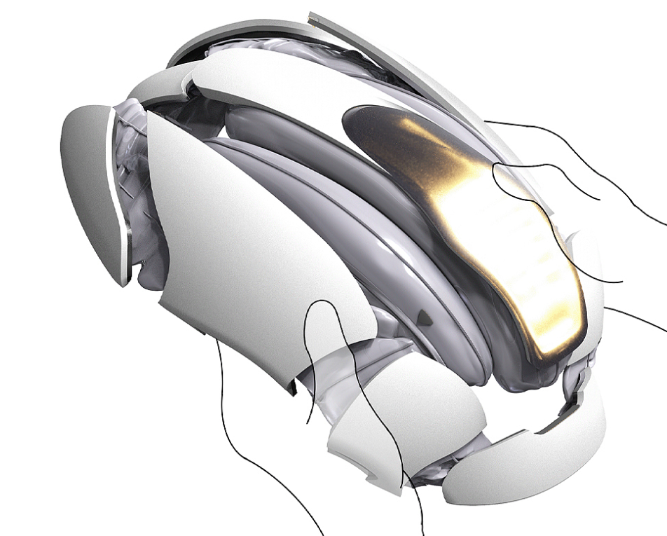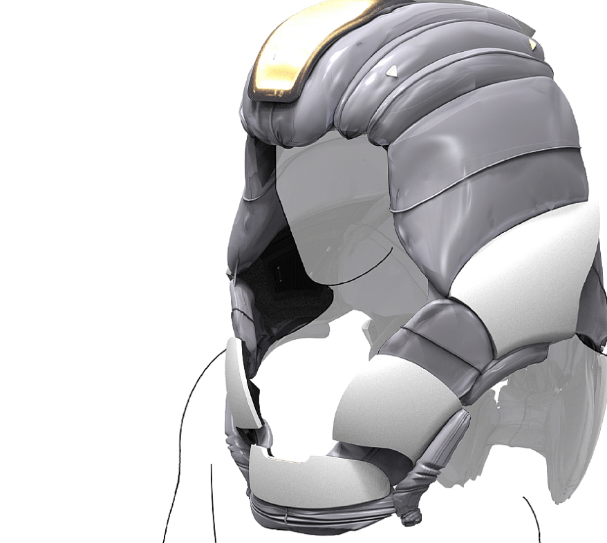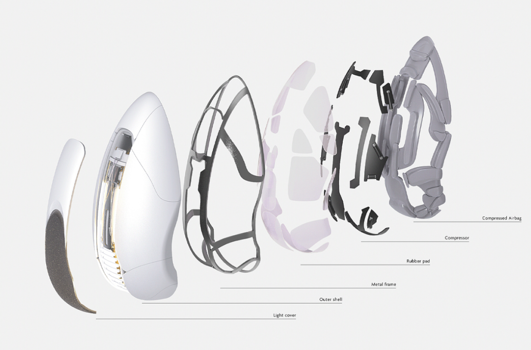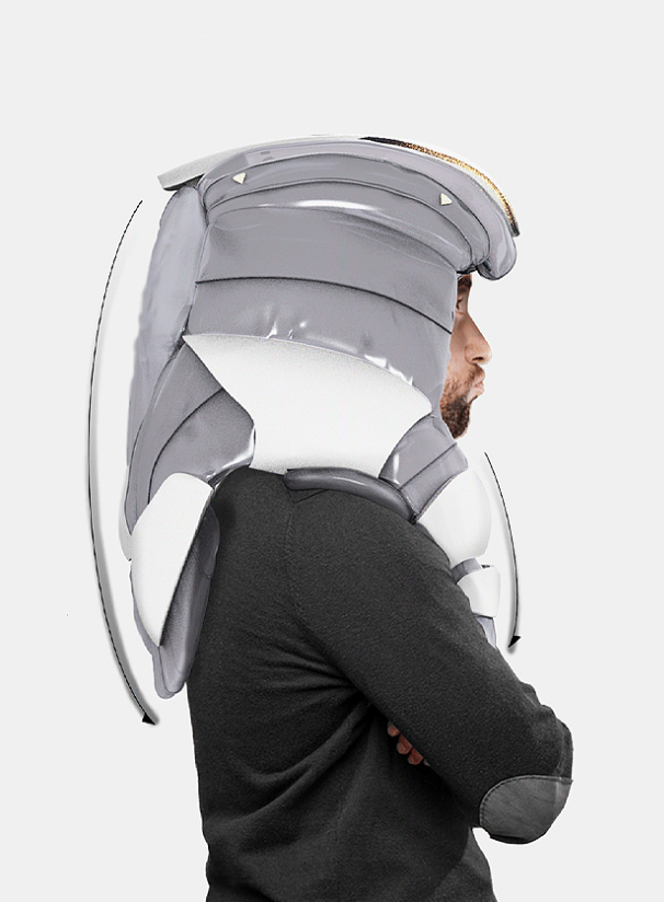 一旦从墙上拆下,Testudo 就会呈现出类似于自行车头盔的大小和形状,用户可以将它放在头上并覆盖肩膀。一旦头盔的把手被拉到用户的胸部,集成的安全气囊就会膨胀并变硬以提供缓冲保护。