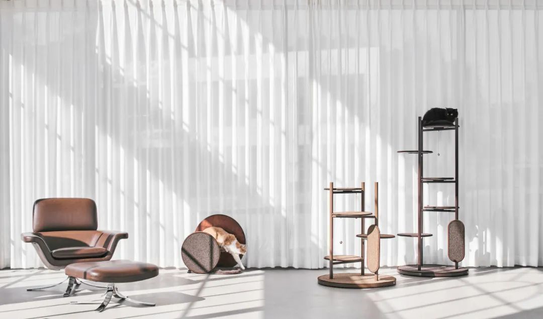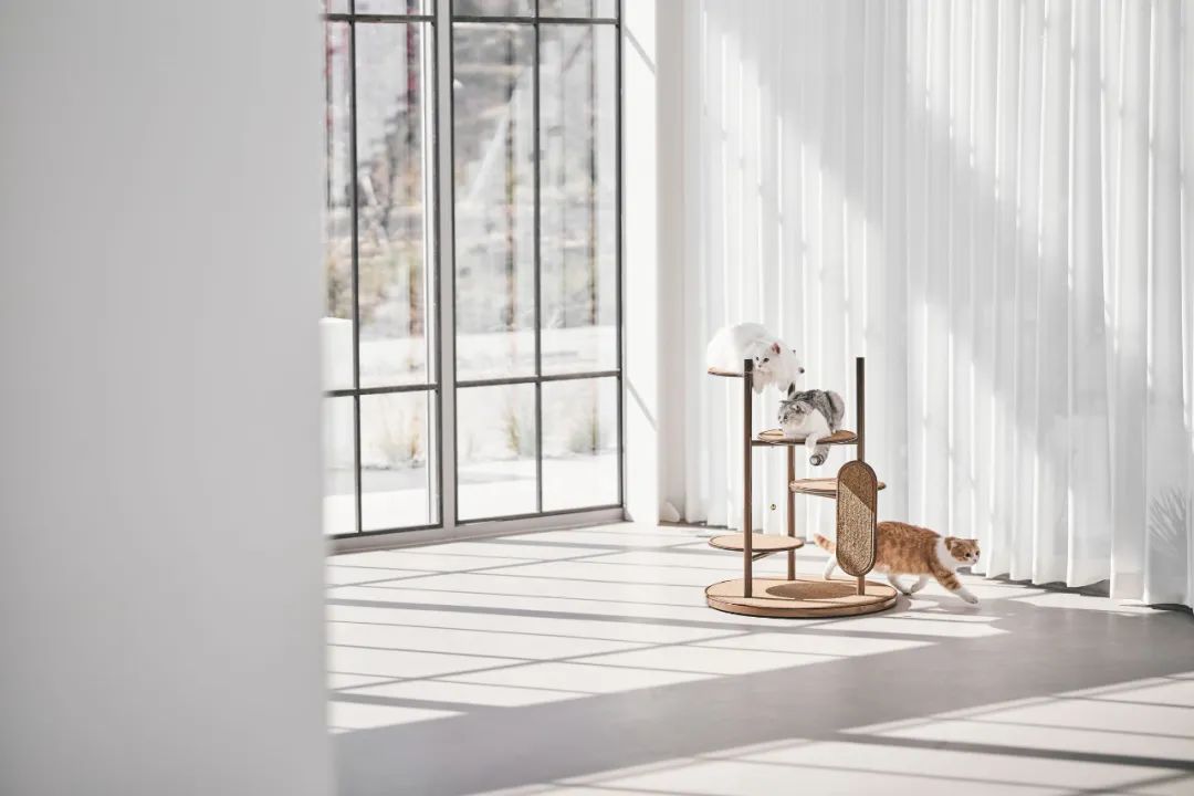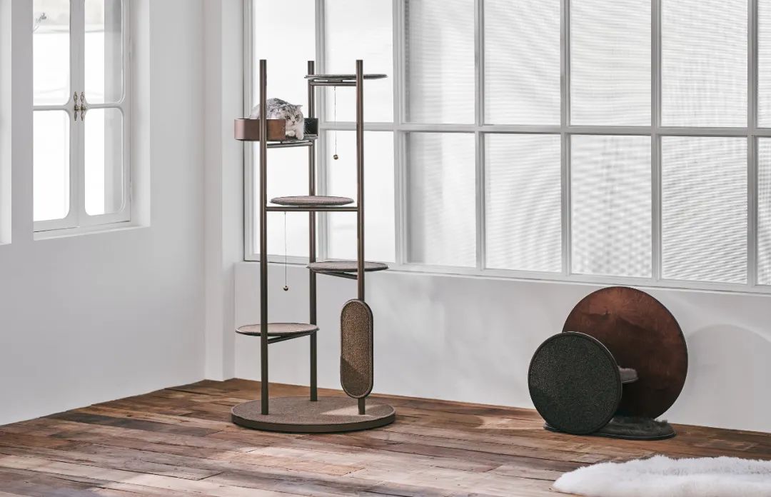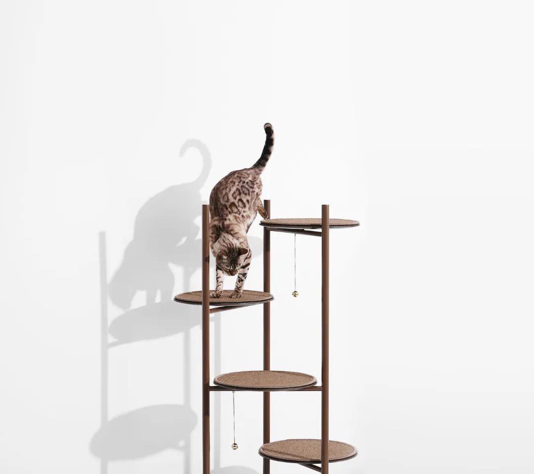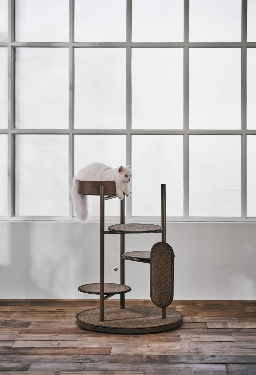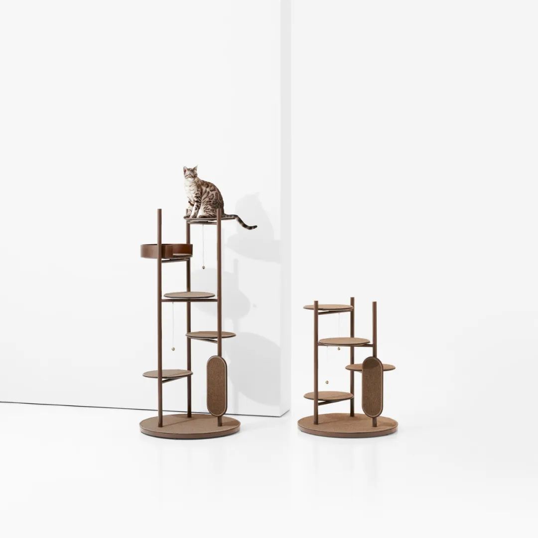 这是一款高档家具式的猫塔,选择了金属作为主要材料。它启用了一个坚固而紧凑的猫塔,还可以支持任何猫的活动,包括频繁的垂直动作。由桦木制成的附加平台是模块化的,以确保可以轻松迅速地处理任何磨损。垂直刮板和悬挂金属球是猫玩耍和装饰的工具。