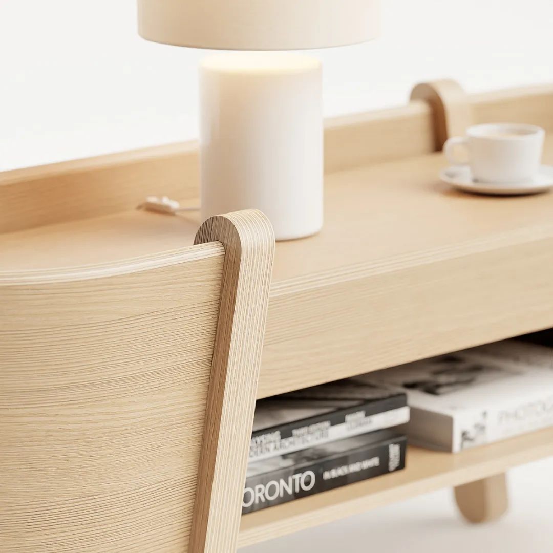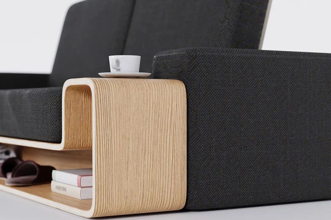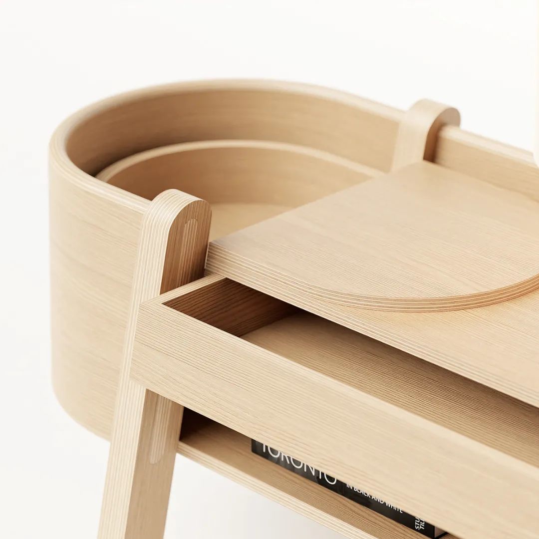 这款产品的出发点是腿部关节,特别是弯曲的形状如何融合在一起,两个侧边抽屉是垂直打开的,一个传统的抽屉在中间,一个开放式的搁板在底部。当产品靠着墙壁时,侧面设计的缺口,电源线能更轻松的通过。