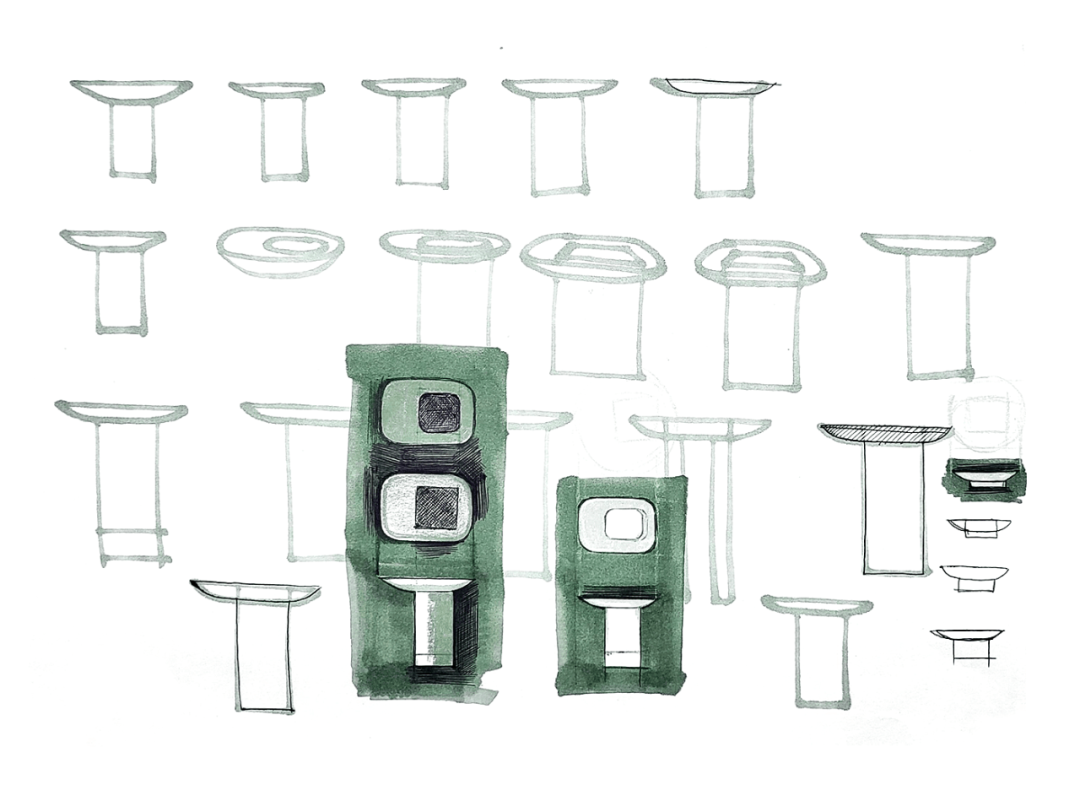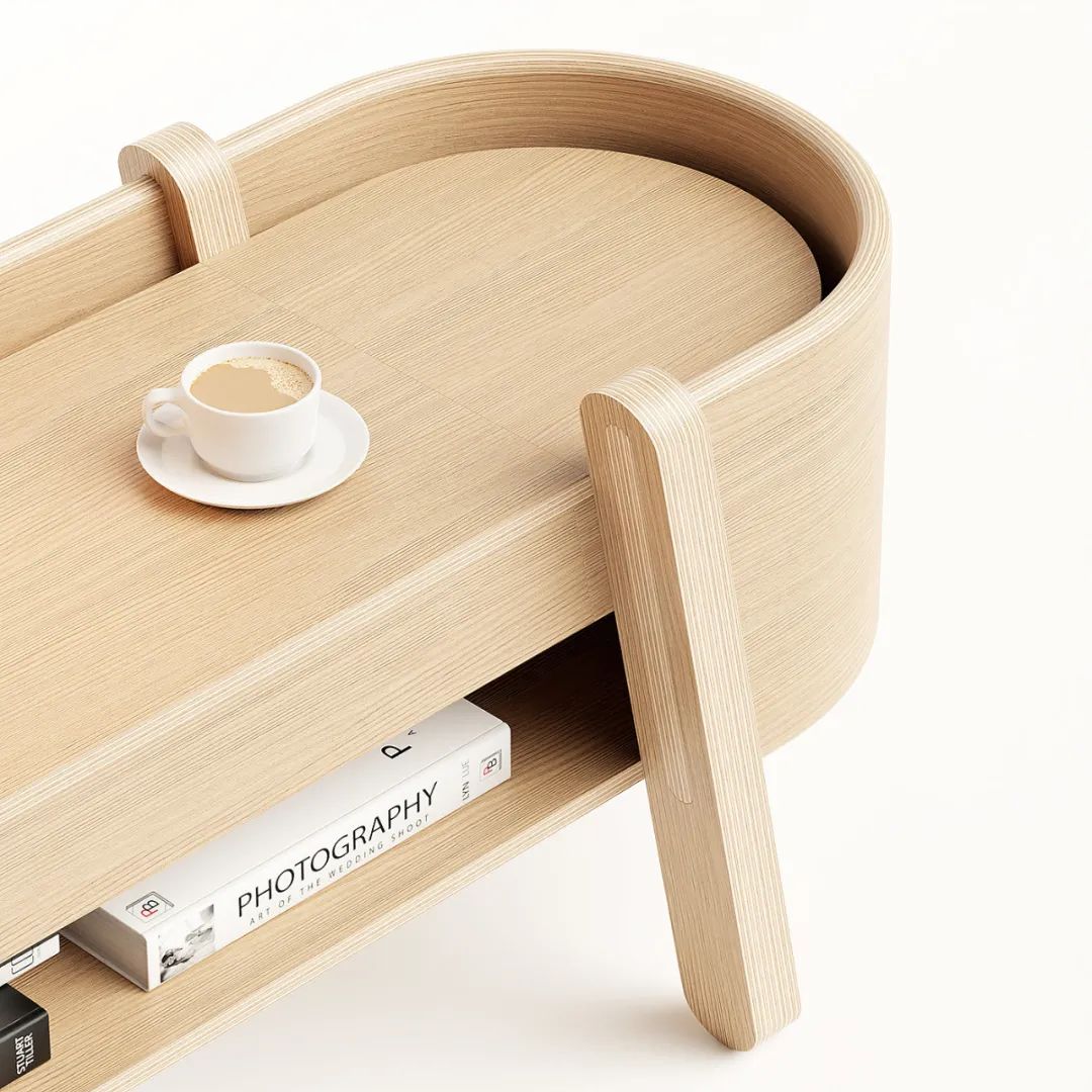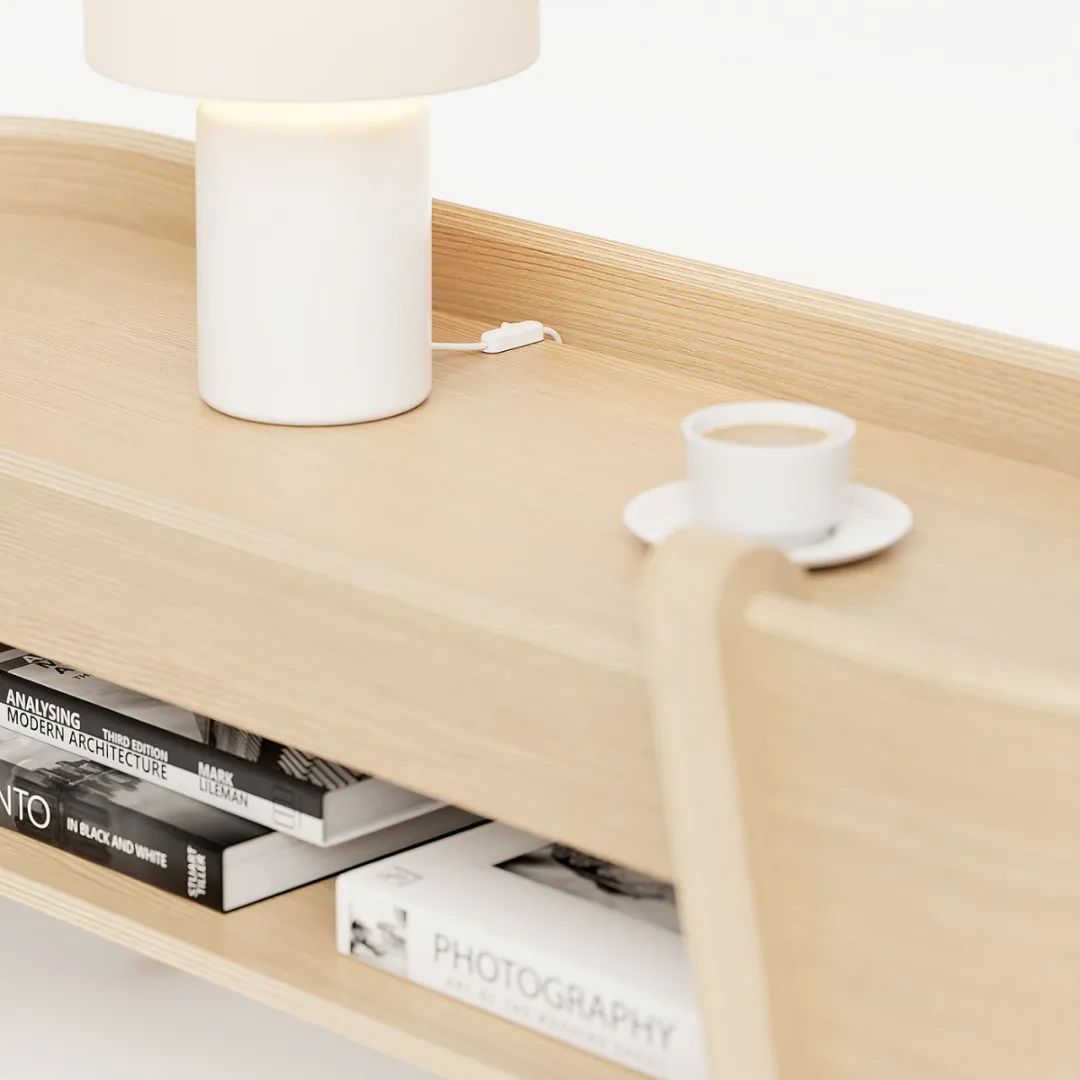 这款产品的出发点是腿部关节,特别是弯曲的形状如何融合在一起,两个侧边抽屉是垂直打开的,一个传统的抽屉在中间,一个开放式的搁板在底部。当产品靠着墙壁时,侧面设计的缺口,电源线能更轻松的通过。