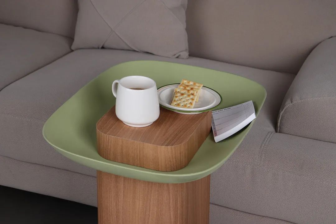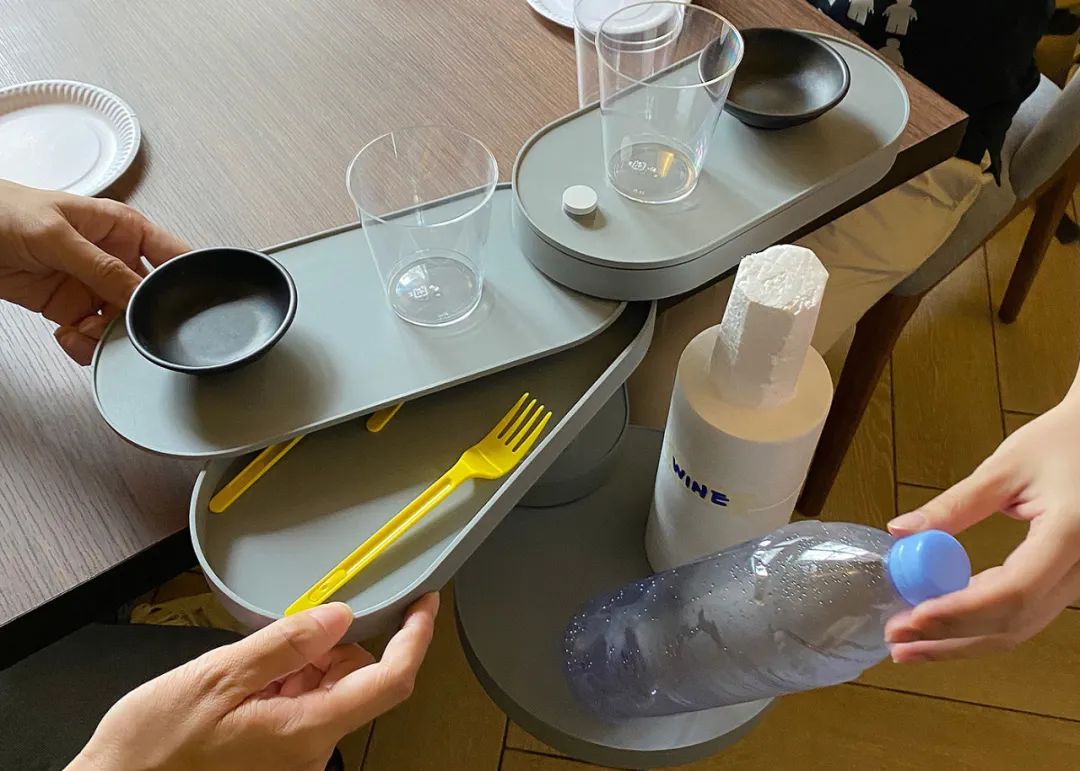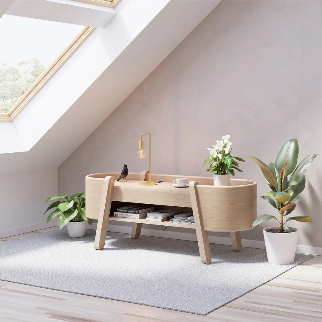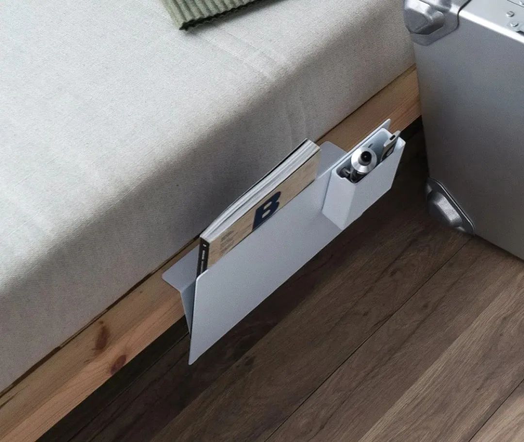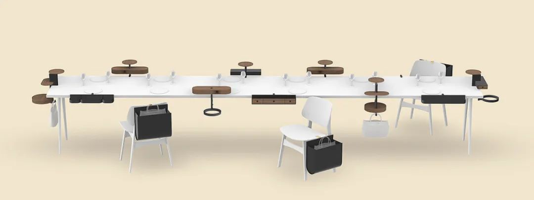 所以设计师把篮子和桌子结合起来。将桌面杂物扫进篮子里,桌面就可以置物了。