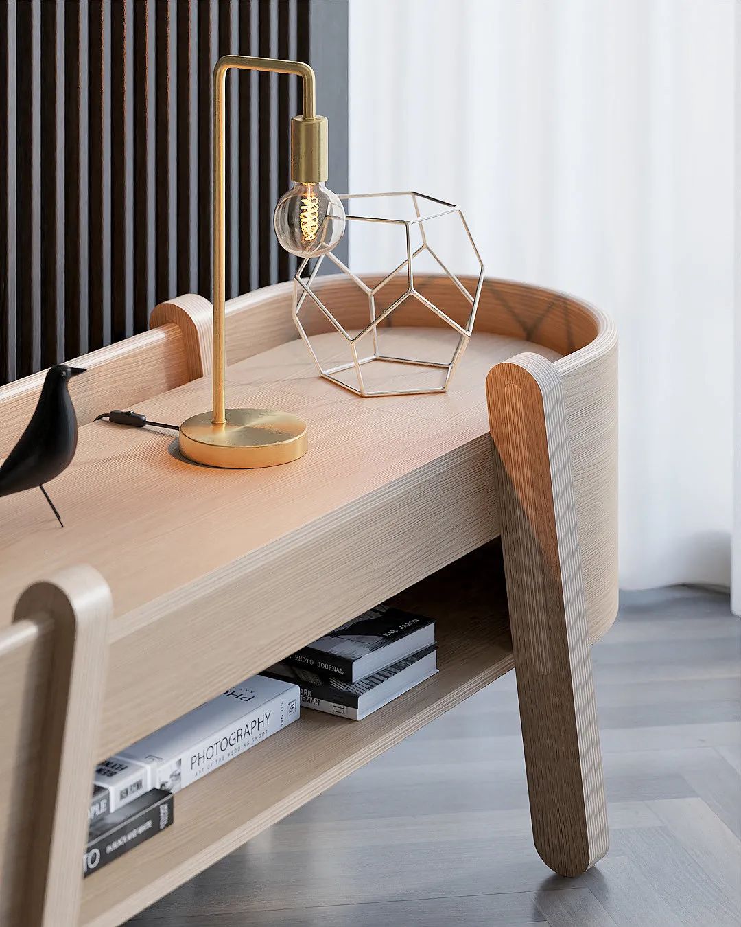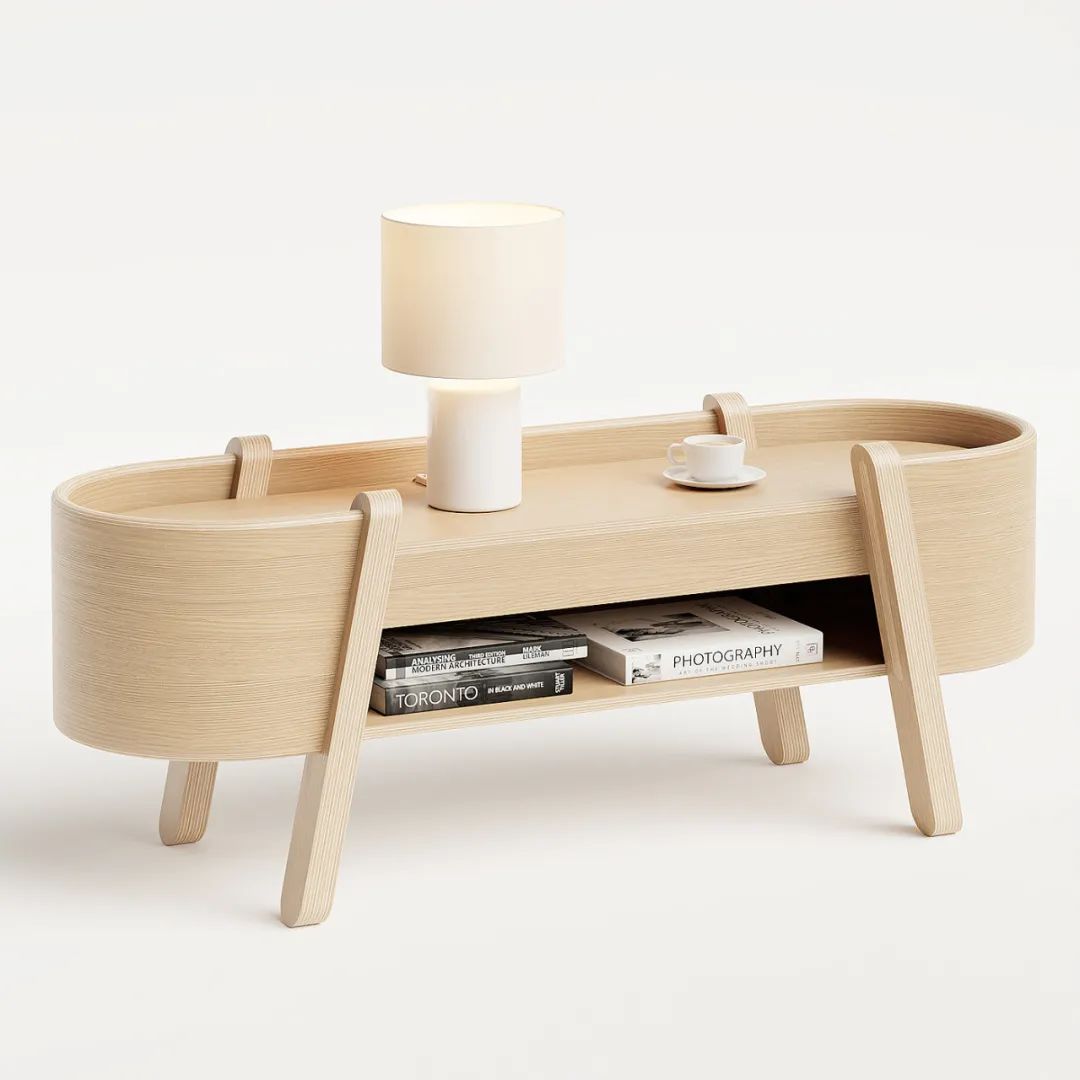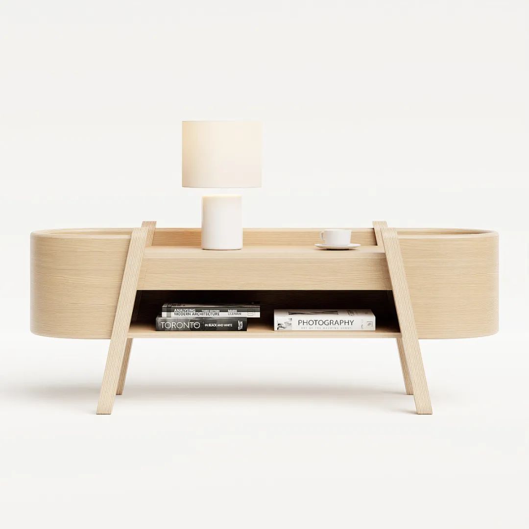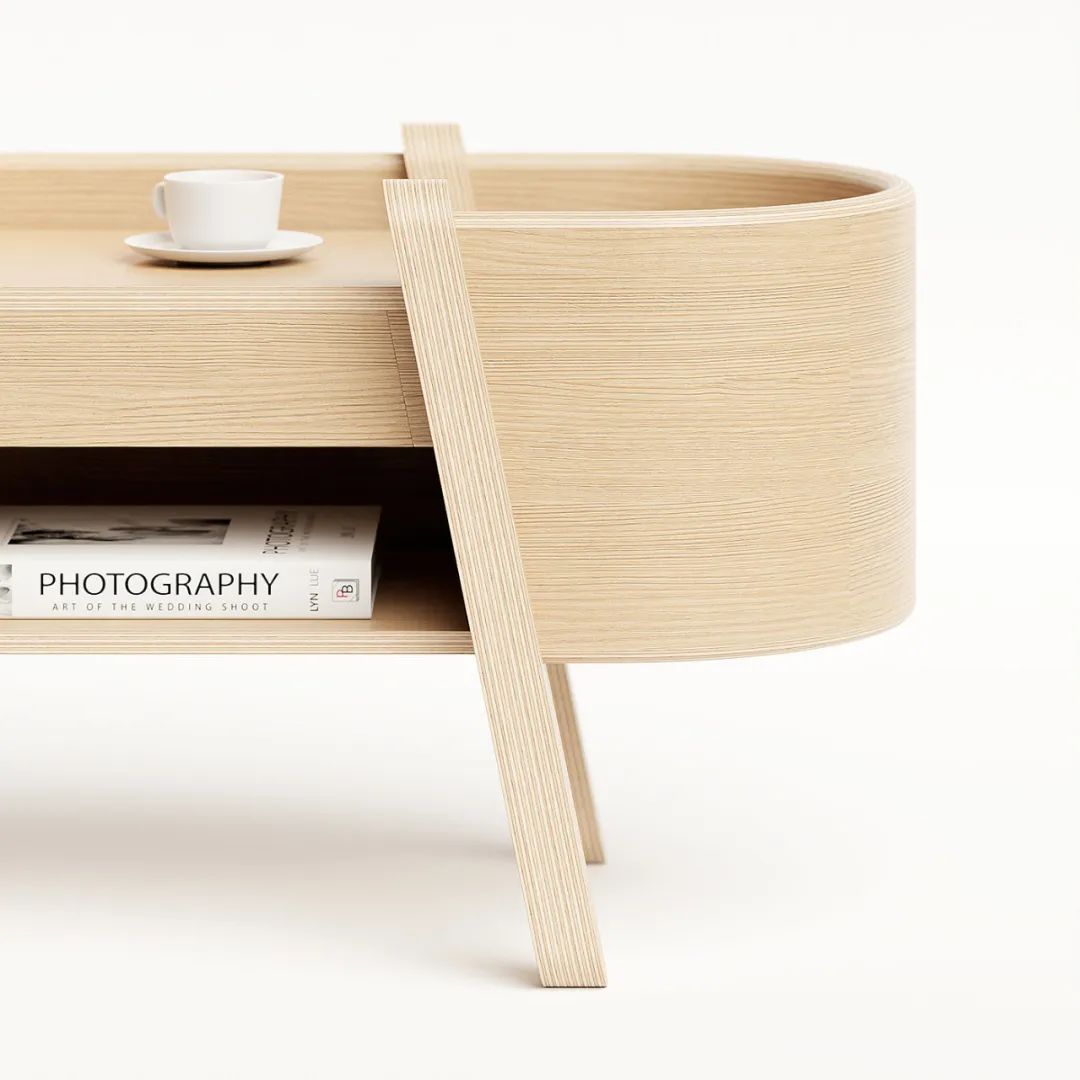 Embrace收纳柜,独特的关节,柔软的曲线和重叠的层。更独特的元素在于弯曲的胶合板带,拥抱整个单元,因此得名Embrace。
